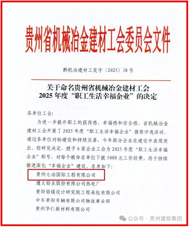 在企业人文关怀领域,贵州七冶国际工程有限公司获评2025年度“职工生活幸福企业”,体现了集团在提升职工获得感、幸福感和归属感方面的持续努力。