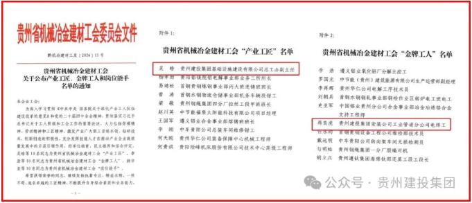 与此同时,集团涌现出一批技能精湛、爱岗敬业的先进个人:贵州省建设投资集团基础设施建设有限公司吴晗荣获“产业工匠”称号;七冶安装工程有限责任公司蒋良虎获评“金牌工人”。他们的精湛技艺与敬业精神,彰显了新时代产业工人的风采。