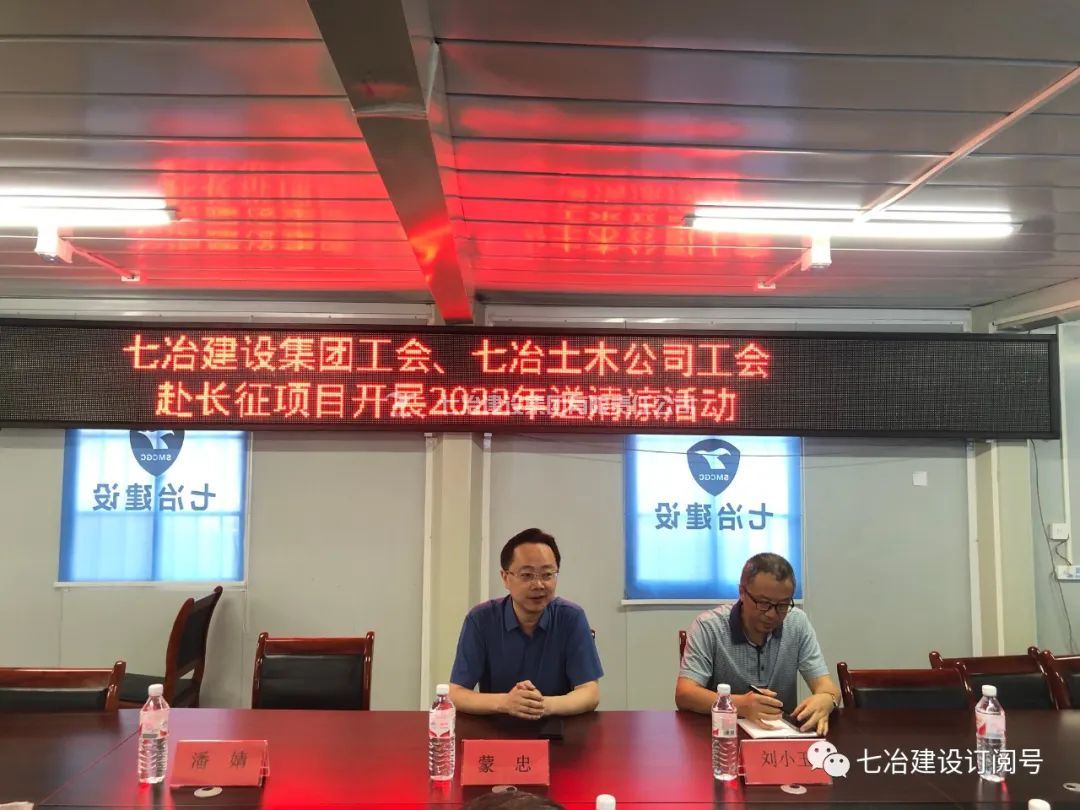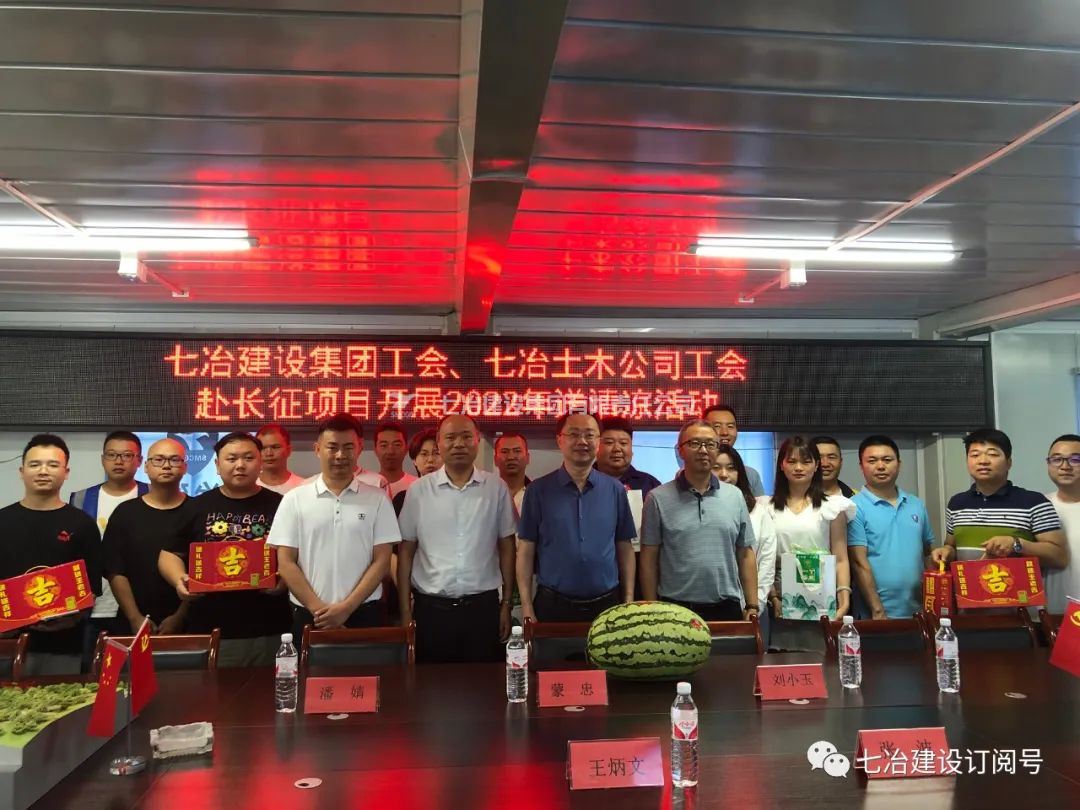 时值盛夏,烈日炎炎。7月26日,七冶建设集团党委副书记、工会主席蒙忠,工会副主席刘小玉一行,赴长征数字科技艺术馆工程项目部开展“喜迎党的二十大·盛夏送清凉”活动,向高温下坚守岗位的一线职工送去清凉和关怀。七冶土木公司党委书记王炳文、副总经理张波陪同。
