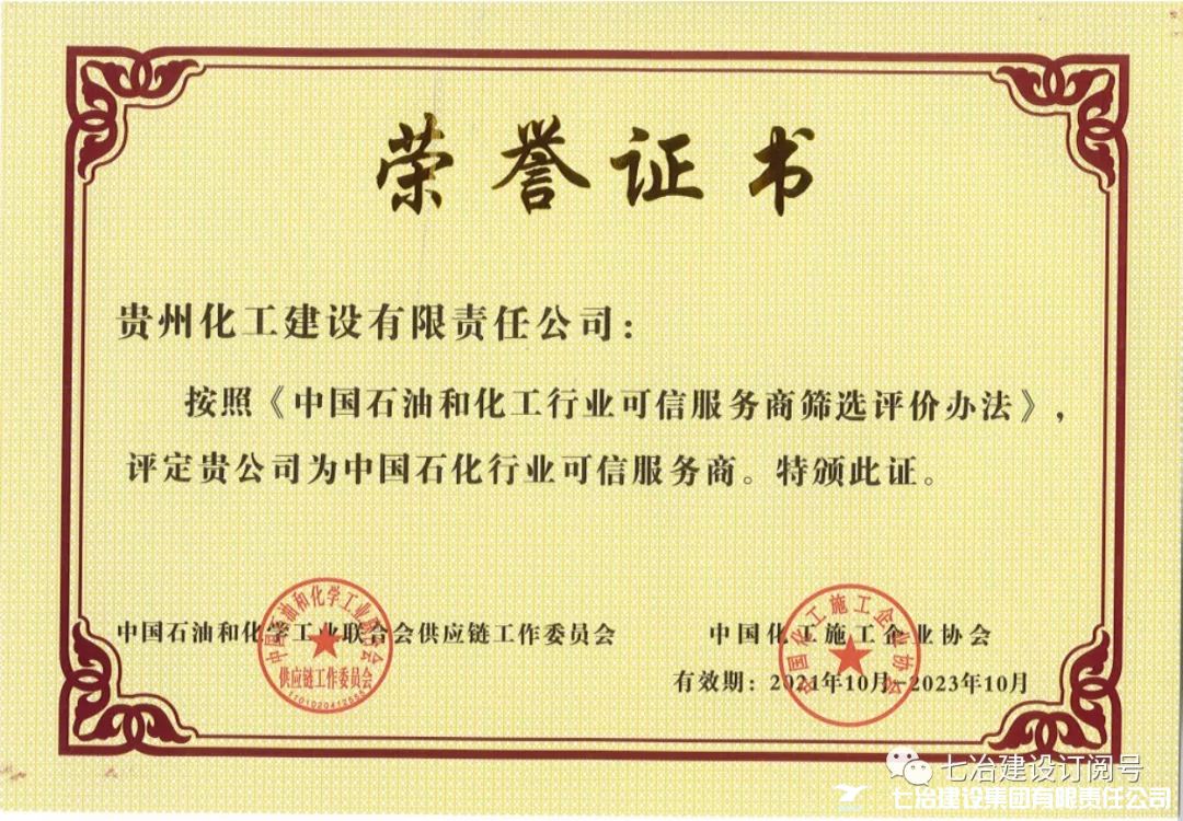 近日,经中国石油和化学工业联合会供应链工作委员会、中国化工施工企业协会初审,平台及认证公司复审,专家组综合评价,中国石油和化学工业联合会官网、石化行业供应商寻源平台全国公示等环节,七冶(集团)贵州化工建设有限责任公司在众多服务商企业中脱颖而出,成为为数不多获得中国石油和化工行业可信服务商资格的施工类企业。