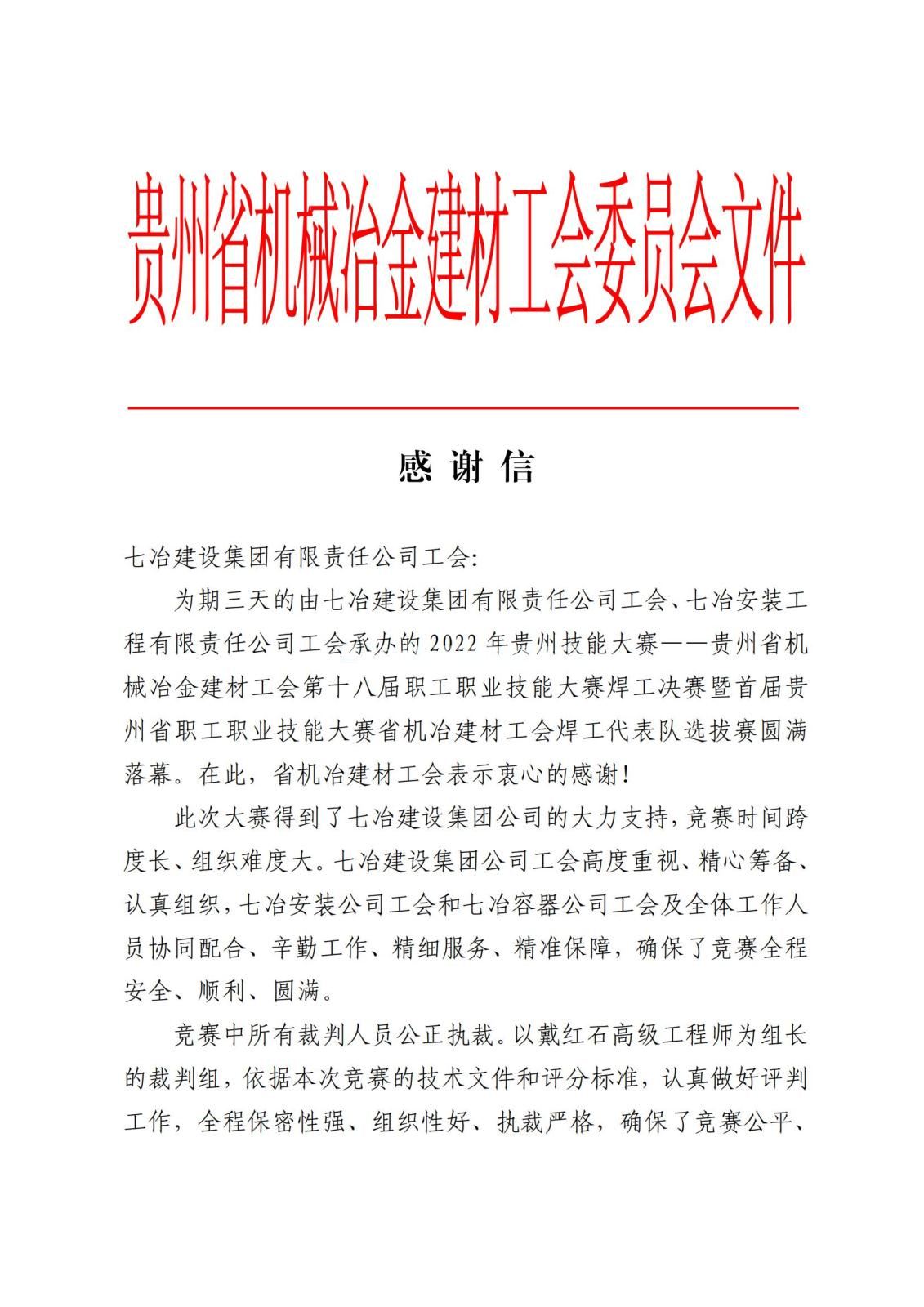 7月19日,贵州省机械冶金建材工会向七冶建设集团工会发来感谢信,对由七冶建设集团工会、七冶安装公司工会承办的贵州省机械冶金建材工会第十八届职工职业技能大赛焊工决赛的成功举办表示感谢,对竞赛全体裁判员及工作人员的辛勤付出表达敬意。