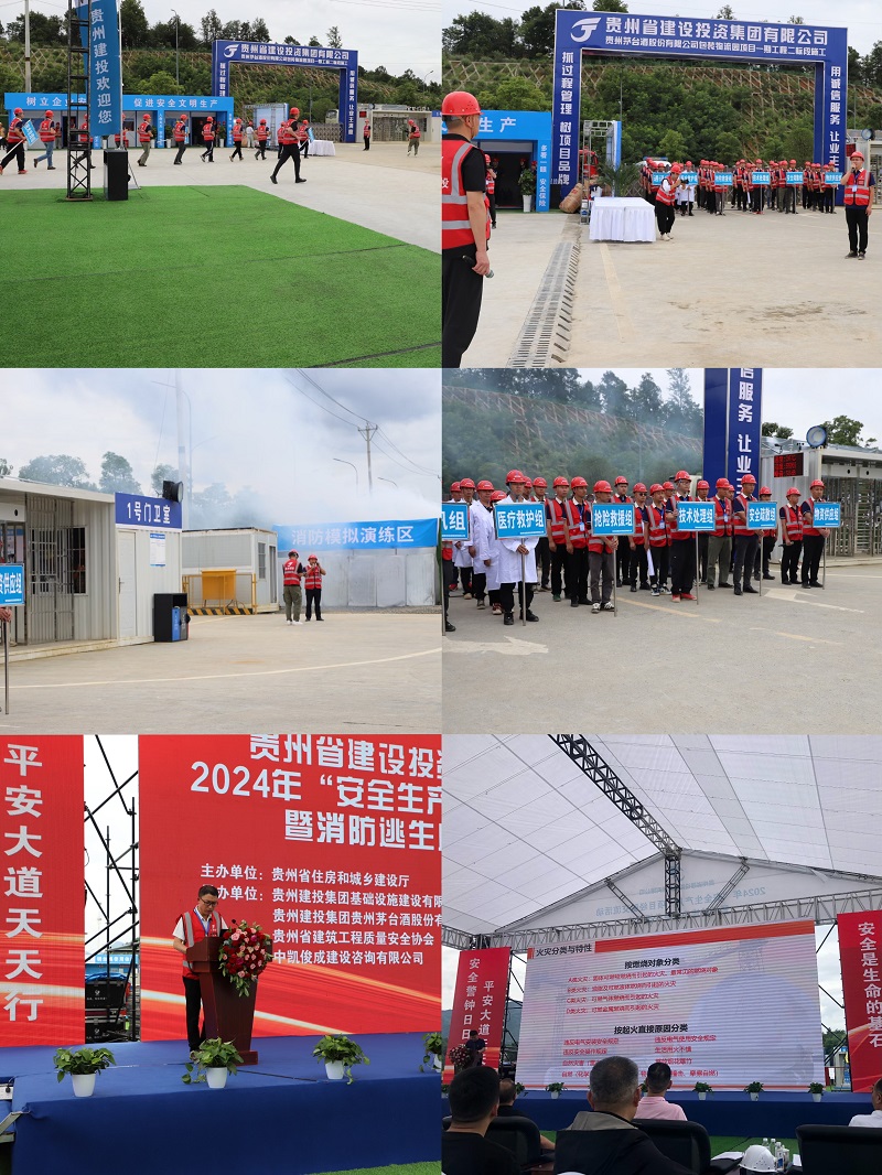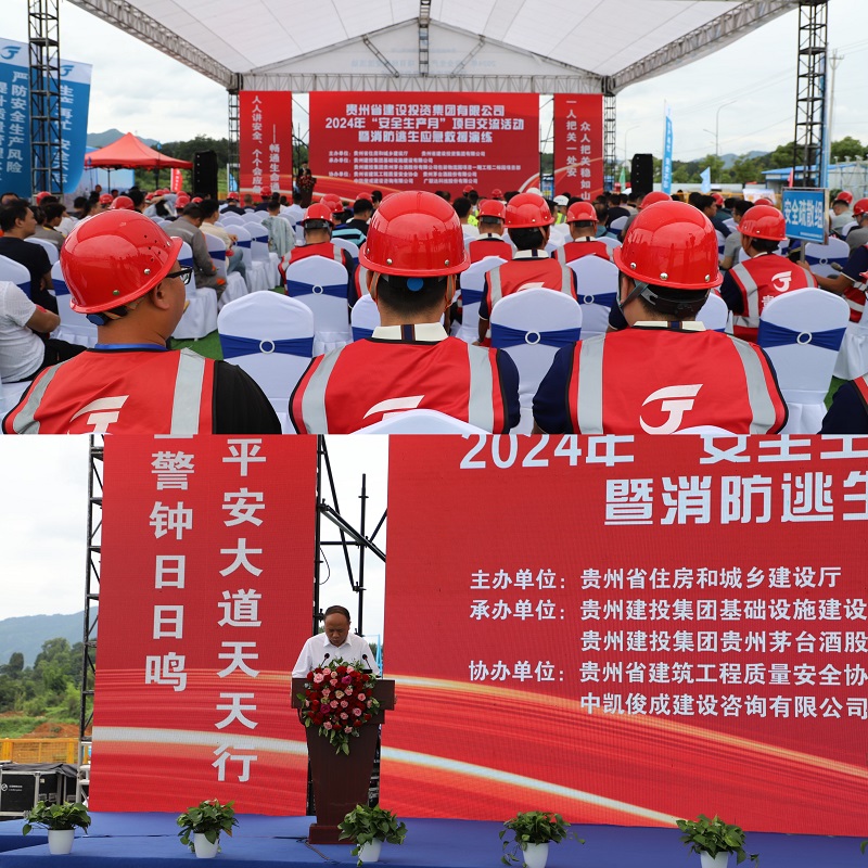 6月25日,贵州省住建厅、贵州建投集团联合主办的2024年“安全生产月”项目交流活动暨消防逃生应急救援演练,在集团承建的茅台包装物流园项目部举行。省住建厅、省建筑工程质安协会、贵州建投集团等单位相关领导出席。