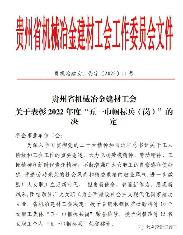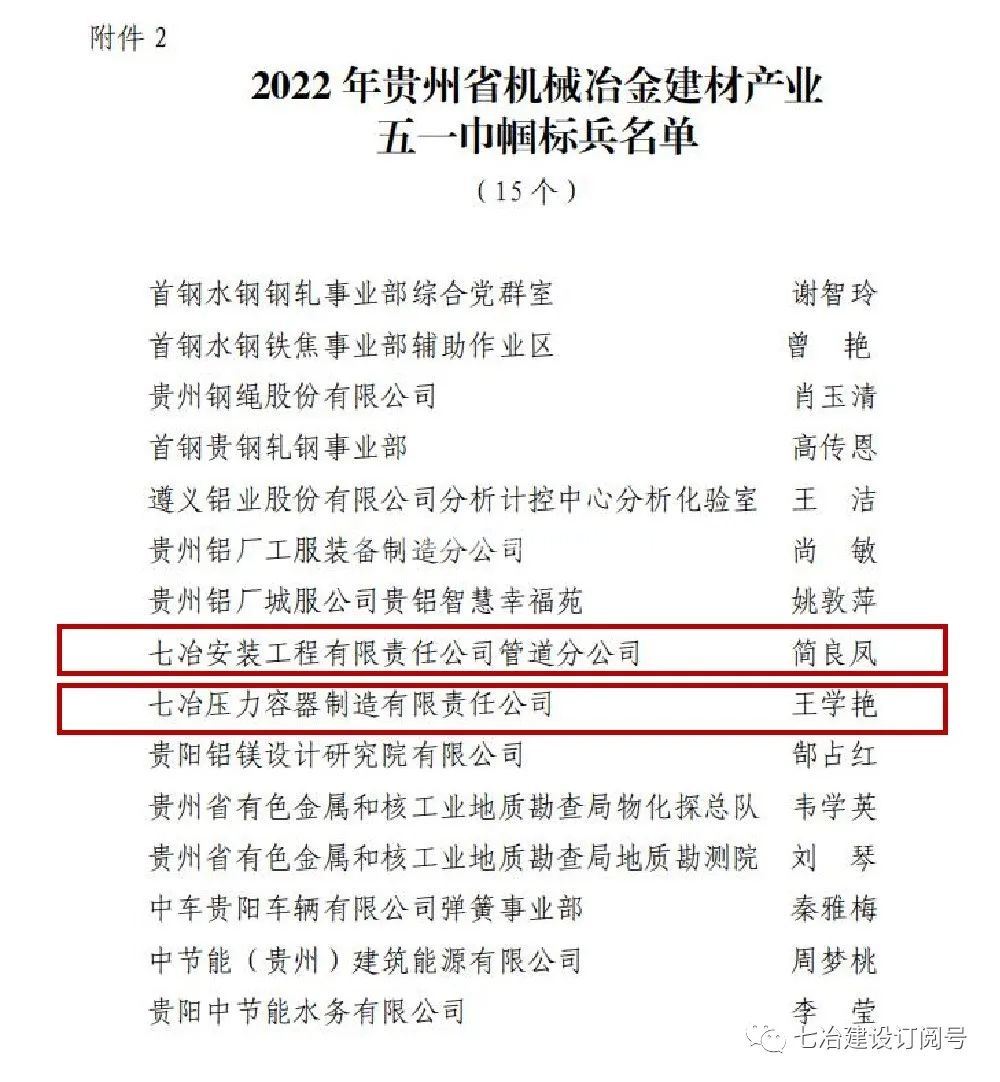 - 七冶职工简良凤王学艳喜获2022年贵州省机械冶金建材产业“五一巾帼标兵”荣誉称号