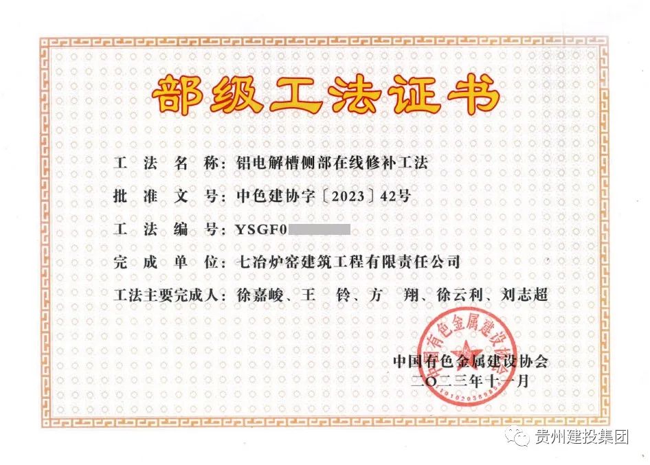 此外,在中国有色金属建设协会公布的2023年度部级施工工法名单中,贵州建投集团下属七冶炉窑公司完成的《铝电解槽侧部在线修补工法》和《铝电解槽阴极精密中小修工法》榜上有名。为技术创新再添新成果的同时,标志着集团在施工质量、技术革新、项目管理等方面实现新突破。